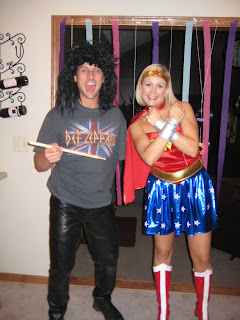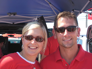 Anyway, Saturday was Bo's debut game. The crowd was super crazy and loud. Jim and I got in to Lincoln around 1:30 so we could tailgate with my sister and her husband before the 6 pm game (I know, we were cutting it a little close. :) We just wanted to make sure we were not late). They have a tailgating spot across the road from the stadium. It is so cool to have that stadium in the background. If you are not a freaky football fan like we are, this may be hard to understand. As you can see, the dress requirement for the day is red, red, and more red, with the occasion white and black thrown in.