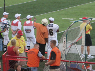 Former Husker greats Irving Fryer and Mike Rozier (in the orange shirt pointing up) were on the sidelines in front of us. Fryer's son plays on the Western Michigan team. Jim and I had awesome seats- 40 yard line, 10 rows up. We could see everything!