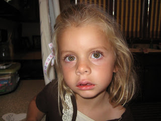 Today at Preschool, Alex had a little accident. Her and a little boy crashed into each other. Alex ended up on the losing end of that one. The poor thing has a huge upper lip. Her gums were bleeding quite a bit and a tooth is loose. Alex had blood all over her shirt and pants and her teacher ended up with blood all over her pants as well. She is a sad, sad sight.